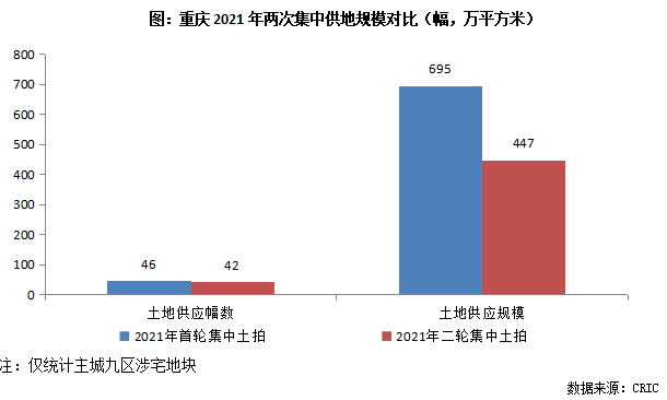 從土地供應(yīng)規(guī)模上來看,重慶(僅考慮主城九區(qū))二輪集中土拍供應(yīng)宅地較首輪明顯減少,涉及42宗宅地,總供應(yīng)建面僅447萬平方米,較首輪總供應(yīng)規(guī)模減少了36%;分區(qū)域來看,北碚區(qū)、沙坪壩區(qū)和九龍坡區(qū)等環(huán)線外區(qū)域土地供應(yīng)比較集中,分別有9、8、8宗,南岸區(qū)、渝北區(qū)、巴南區(qū)、江北等區(qū)域供地相對(duì)較少,均不足5宗。
