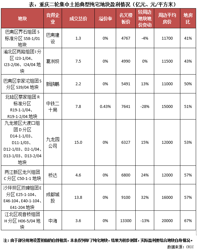 而就盈利情況來看,平均地房比為0.52(不考慮含自持租賃的地塊,下同),較首輪明顯提升,尤其是巴南、渝北的一些地塊,地房比低至0.4,典型如巴南區(qū)界石組團(tuán)S標(biāo)準(zhǔn)分區(qū)S58-1/01地塊,樓面價(jià)僅有4767元/平方米,這一價(jià)格較萬科在周邊拿下的同類地塊樓板價(jià)要低4%(該地在首輪集中出讓,樓板價(jià)4975元/平方米),按照周邊在售項(xiàng)目平均銷售價(jià)11700元/平方米來測(cè)算,地房比低至0.41,房地差近7000元/平方米,盈利空間十分可觀。即使是本場(chǎng)土拍中唯一溢價(jià)成交的北碚區(qū)蔡家地塊(樓板價(jià)7641元/平方米),按照周邊在售均價(jià)15000元/平方米來測(cè)算的話,地房比也僅有51%,也能保持良好的盈利。
