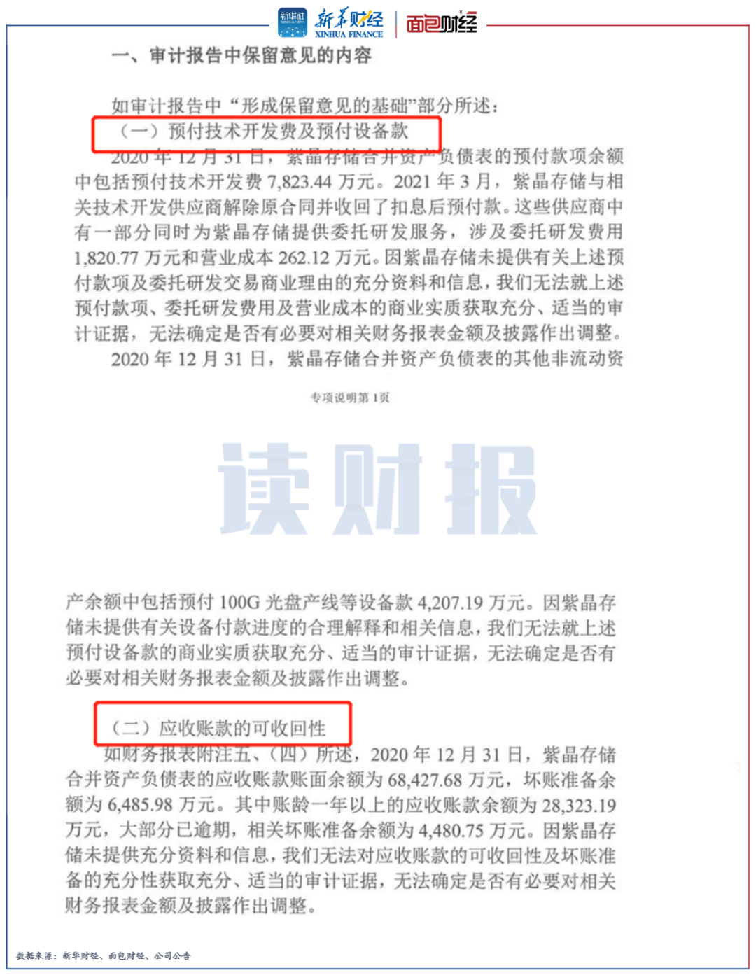 目前,根據(jù)紫晶存儲(chǔ)披露的立案告知書,未具體說(shuō)明哪些信披涉嫌“違法違規(guī)”。紫晶存儲(chǔ)于2020年2月上市,而立信會(huì)計(jì)師事務(wù)所對(duì)該公司2020年的財(cái)務(wù)報(bào)表遂出具了保留意見(jiàn)審計(jì)報(bào)告,主要涉及“預(yù)付技術(shù)開發(fā)費(fèi)及預(yù)付設(shè)備款”和“應(yīng)收賬款的可收回性”。