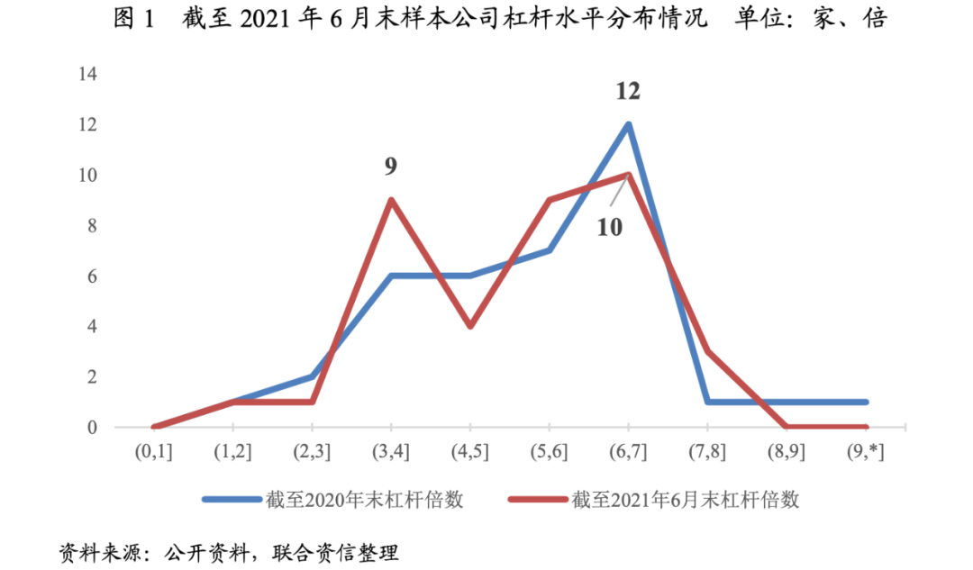 杠桿倍數(shù)不超過8倍。以2020年末數(shù)據(jù)為基礎(chǔ),樣本公司[2]中杠桿倍數(shù)[3]超過8倍的有2家,并且這2家樣本公司2021年以來杠桿倍數(shù)均出現(xiàn)下降。截至2021年6月末,樣本公司的杠桿倍數(shù)均小于8倍。從下圖來看,截至2021年6月末,樣本公司杠桿倍數(shù)主要分布在3~4倍和在6~7倍。同時(shí),2021年以來,樣本公司杠桿倍數(shù)整體偏移到較小區(qū)間,大部分樣本公司杠桿水平控制在合理范圍之內(nèi)。