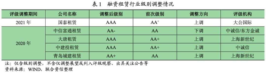 2021年以來,依據(jù)公開可查資料,新增1家融資租賃公司(以下分析均不包含金融租賃公司)發(fā)生信用等級遷移,即國泰租賃評級發(fā)生上調(diào),無新增有公布的評級下調(diào)的融資租賃公司。