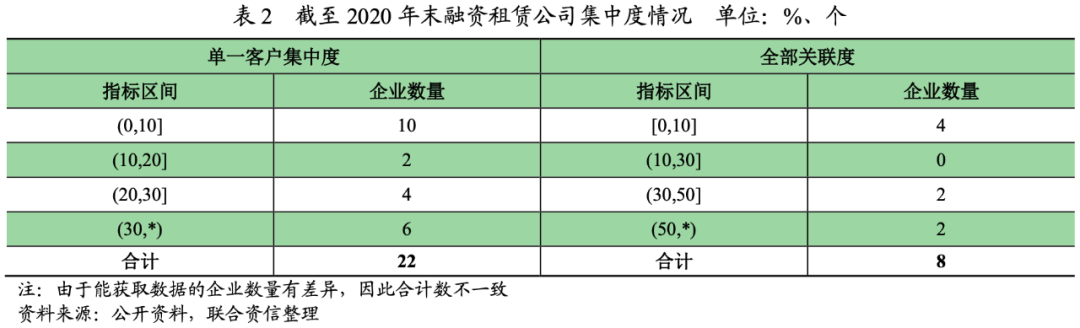 據(jù)了解,許多融資租賃公司尚未確定明確的轉(zhuǎn)型方案,尤其是對于關(guān)聯(lián)集中度超過50%的融資租賃公司。雖然融資租賃公司可能選擇采用與其他企業(yè)交換資產(chǎn)的方式來降低集中度,但未來能否順利施行仍有待觀察。部分融資租賃公司已經(jīng)開始拓展集團(tuán)外的業(yè)務(wù),由于租賃周期通常在3年以上并且對集團(tuán)外部業(yè)務(wù)的風(fēng)險(xiǎn)把控能力有待檢驗(yàn),因此短期內(nèi)集中暴露風(fēng)險(xiǎn)的可能性不大,但在未來的一個(gè)租賃周期及經(jīng)濟(jì)周期內(nèi)仍可能會出現(xiàn)資產(chǎn)質(zhì)量下降的情況。截至2020年末,公開并且能獲取到客戶集中度數(shù)據(jù)的融資租賃公司中單一客戶集中度超過30%的有6家;全部關(guān)聯(lián)度超過50%的有2家。