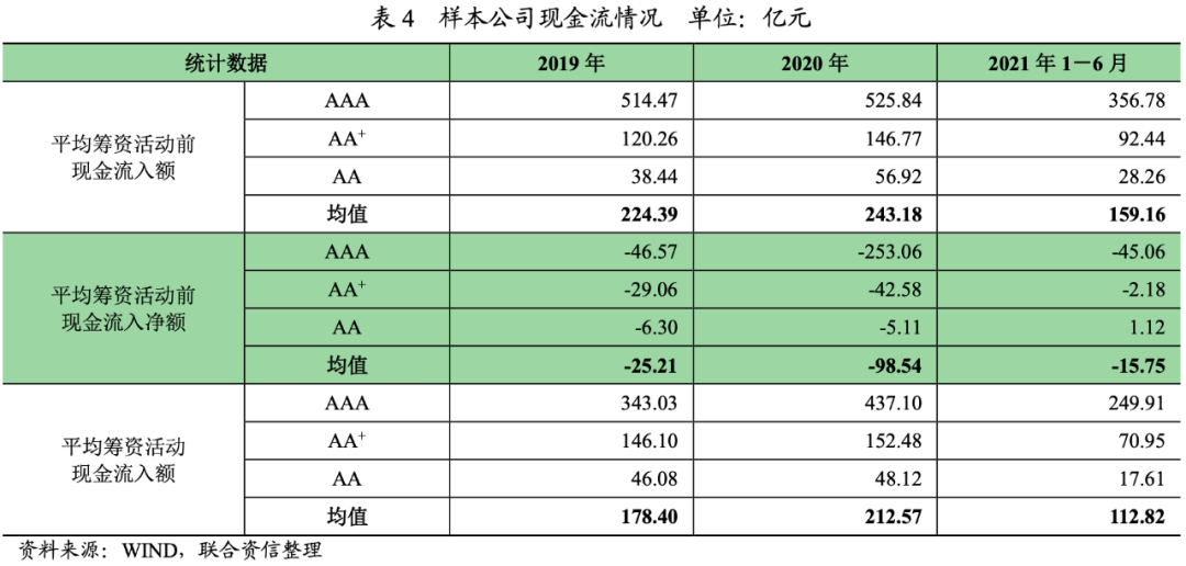 從業(yè)務(wù)內(nèi)生現(xiàn)金流來看,2020年,樣本公司平均籌資活動前現(xiàn)金流入額實(shí)現(xiàn)同比增長。分結(jié)構(gòu)來看,AAA、AA+和AA級別的樣本公司平均籌資活動前現(xiàn)金流入額均實(shí)現(xiàn)了同比增長。2021年上半年,樣本公司平均籌資活動前現(xiàn)金流入額較為平穩(wěn),表明樣本公司正常經(jīng)營產(chǎn)生的現(xiàn)金回流處于較為平穩(wěn)的狀態(tài)。