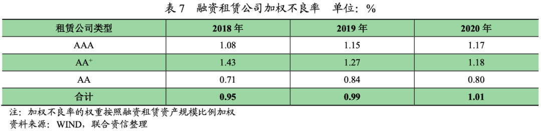 整體看,受近年來宏觀經(jīng)濟(jì)下行,信用風(fēng)險(xiǎn)事件頻發(fā)影響,融資租賃公司不良率總體呈上升趨勢,資產(chǎn)質(zhì)量承壓,但部分風(fēng)控能力較強(qiáng)或主要開展產(chǎn)業(yè)集團(tuán)內(nèi)業(yè)務(wù)的融資租賃公司資產(chǎn)質(zhì)量仍能得到保障,不良率分化趨勢較顯著。在有披露2021年6月末不良率的17家樣本公司中,有5家樣本公司的2021年6月末的不良率較2020年末有所提高。