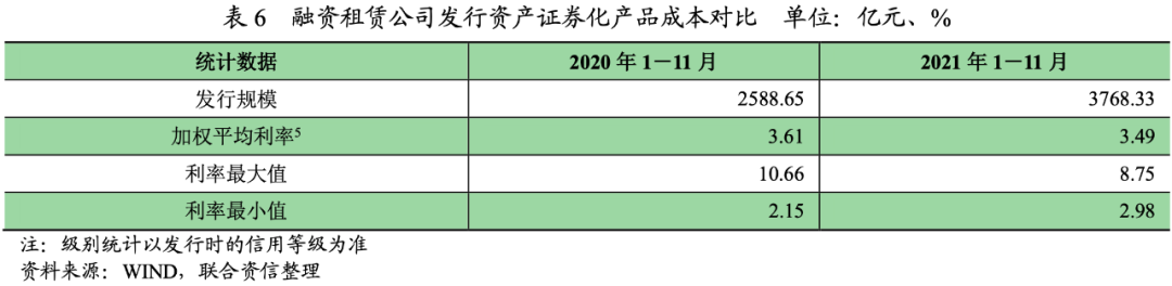 融資租賃公司發(fā)行資產(chǎn)證券化產(chǎn)品融資成本方面,根據(jù)WIND統(tǒng)計(jì),2021年1-11月,融資租賃公司發(fā)行資產(chǎn)證券化產(chǎn)品加權(quán)平均利率為3.34%,較上年同期下降了35bp。融資租賃公司發(fā)行資產(chǎn)證券化產(chǎn)品融資成本較上年同期有所下降。