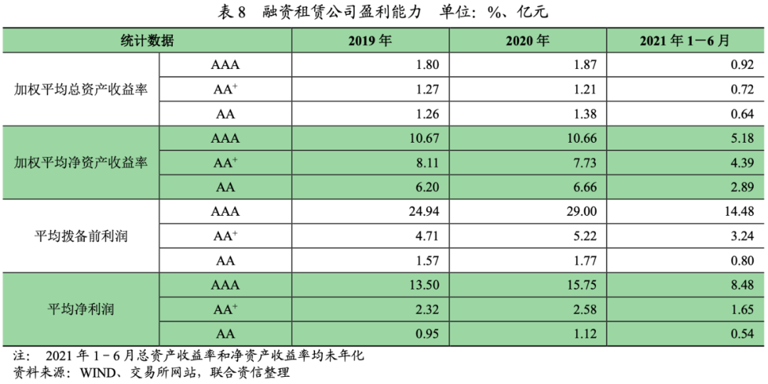 2020年,樣本融資租賃公司盈利規(guī)模有所增長,AAA級別融資租賃公司平均撥備前利潤增速最快,但是,AA級別融資租賃公司的平均凈利潤增長最快。2021年上半年,各級別樣本公司融資租賃公司凈利潤均實(shí)現(xiàn)增長,但是分化明顯。
