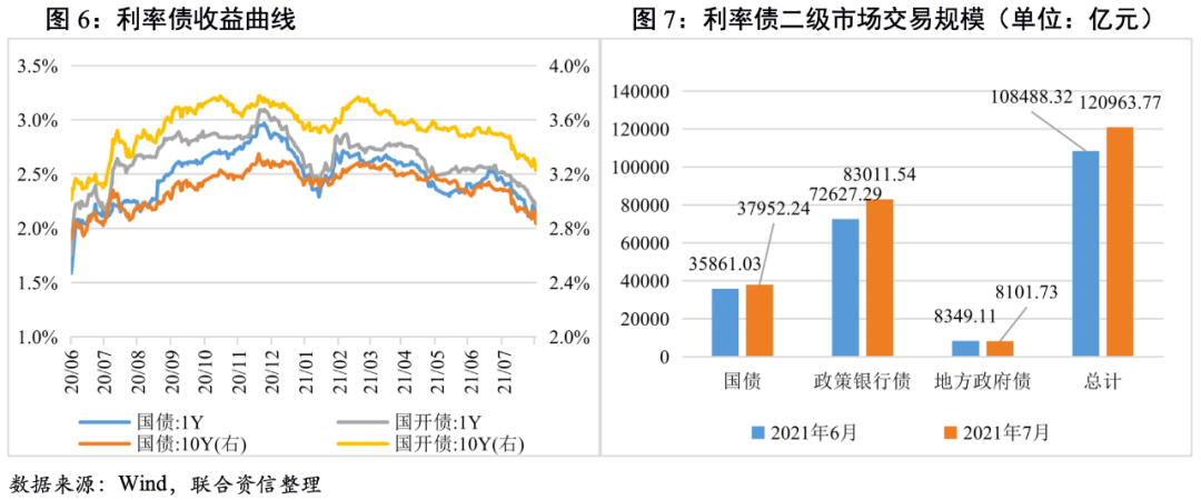 7月利率債收益率整體下行。7月中旬發布的經濟數據雖然好于預期,但利率債收益率并未出現上行,主要是全面降準帶來的降息預期,疊加7月資金面相較6月寬松;6月下旬以來,債市供給壓力上升,但由于河南暴雨以及各地疫情的反彈提升避險情緒,利率債收益率延續下行趨勢。從債市交易規模看,7月債市交易活躍度上升,顯示配置盤需求強勁。