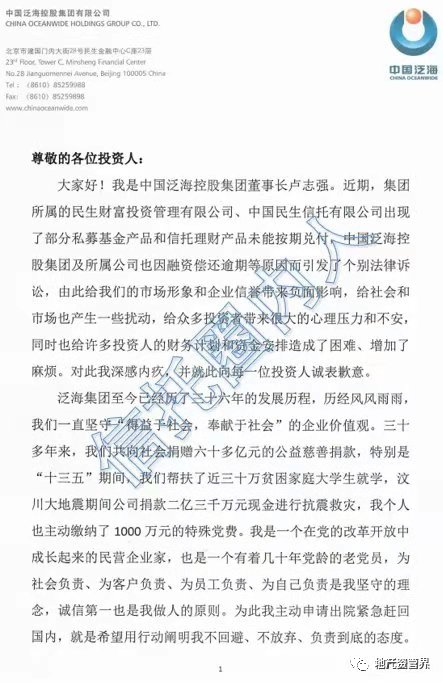 中國泛??毓杉瘓F(簡稱“泛??毓伞保┒麻L盧志強發布了一封“告投資人書”。