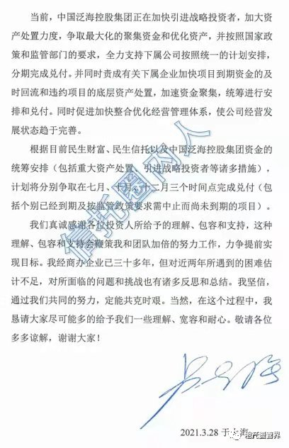 近日,中國泛??毓杉瘓F(簡稱“泛海控股”)董事長盧志強發布了一封“致投資人函”,進一步證實了民生財富、民生信托的暴雷傳聞。