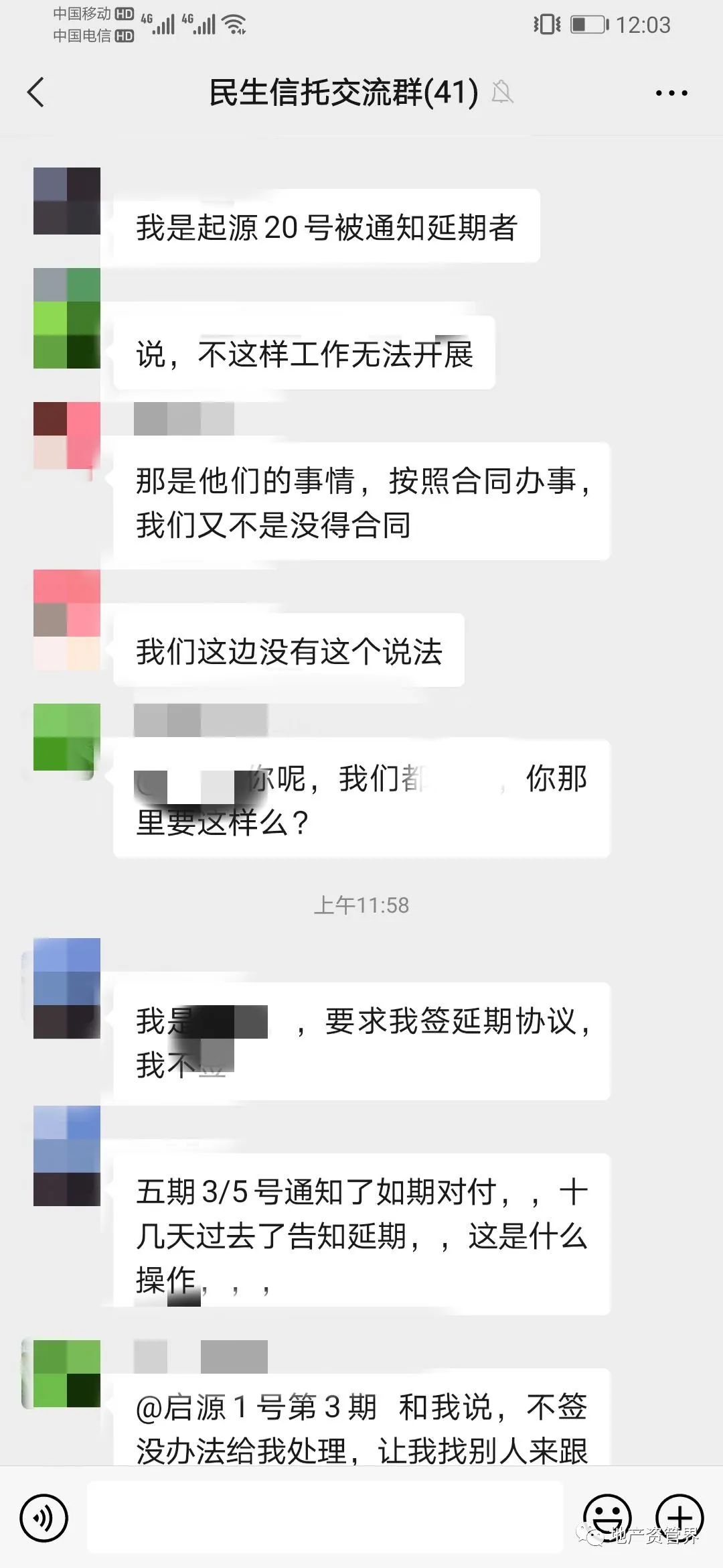 據投資人透露,民生信托-啟源系列出現大批量違約,已經通知投資人簽署延期協議。逾期的項目資金投向也是個謎。
