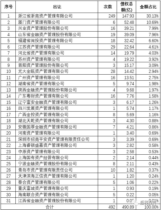共31家地方AMC在2018年有出讓債權記錄,排名前10的地方AMC總計比重達82%,市場集中度較高。由于地方AMC受讓債權后,處置方式多樣,通過再次公開轉讓的形式只是其中之一,導致整體出讓金額只有490.89億,占受讓金額的33%。