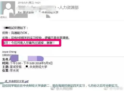 17年5月,愛奇藝被爆出在招聘中地域歧視。被爆出的郵件顯示,愛奇藝一位工作人員在面試了中央財經大學一名學生后,給在人力資源部回復中備注“今后河南人盡量先過濾掉,謝謝!