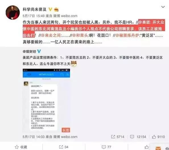 2017年5月,美團內部的一則招聘截圖流出,截圖顯示,一位名叫田某的小領導要招一個運營,提出了他的5個不要:不要簡歷丑的;不要研究生博士生;不要開大眾的;不要信中醫的;原則上不要黃泛區和東北人。消息雖然是發在公司內網,但截圖很快流出,引起口誅筆伐,為美團帶來海量的負面報道。