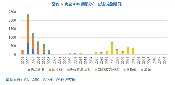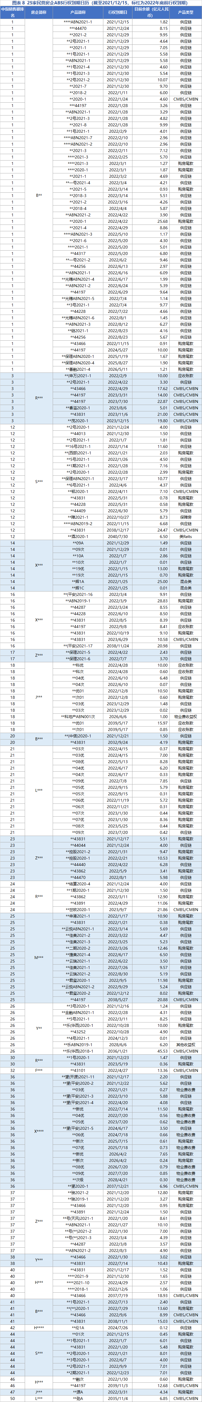 進一步從到期結構看,樣本中大部分房企ABS于2022年年底前行權到期,行權到期的規模在百億以上的依次為B**、X*、S*和M***,兌付壓力值得關注。