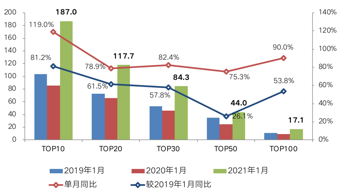 受去年同期正值春節(jié)假日,疊加新冠疫情的爆發(fā)、市場(chǎng)全面停擺影響,整體成交基數(shù)較低,2021年1月百?gòu)?qiáng)房企銷售數(shù)據(jù)在去年基數(shù)較低的基礎(chǔ)上出現(xiàn)強(qiáng)勢(shì)反彈,整體業(yè)績(jī)規(guī)模較去年同期大幅上升70.7%,較2019年同期增長(zhǎng)50.3%。