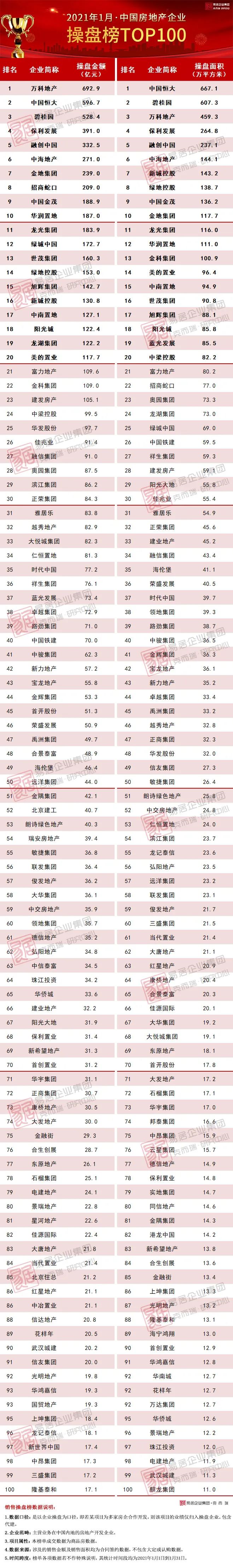 附:2021年1月TOP100房企操盤、銷售排行榜