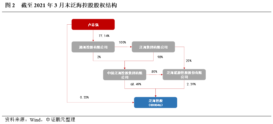 泛海控股,成立于1989年,前身為南海石油深圳開(kāi)發(fā)服務(wù)總公司物業(yè)發(fā)展公司,于1994年在深圳證券交易所上市。截至2021 年3月末,公司控股股東為中國(guó)泛海控股集團(tuán)有限公公司(簡(jiǎn)稱(chēng)“中泛控股”),實(shí)際控制人為盧志強(qiáng),直接和間接持有公司71.23%的股份。