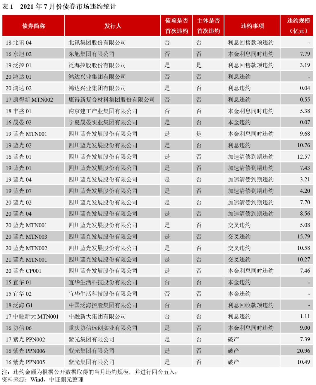 不完全統(tǒng)計(jì),2021年7月份信用風(fēng)險(xiǎn)事件[1]有29次,涉及13家發(fā)行人。其中,首次違約的主體有2家,分別是泛海控股股份有限公司(簡(jiǎn)稱(chēng)泛海控股)、四川藍(lán)光發(fā)展股份有限公司(簡(jiǎn)稱(chēng)藍(lán)光發(fā)展),較上月減少3家。具體看首次違約債券特征: