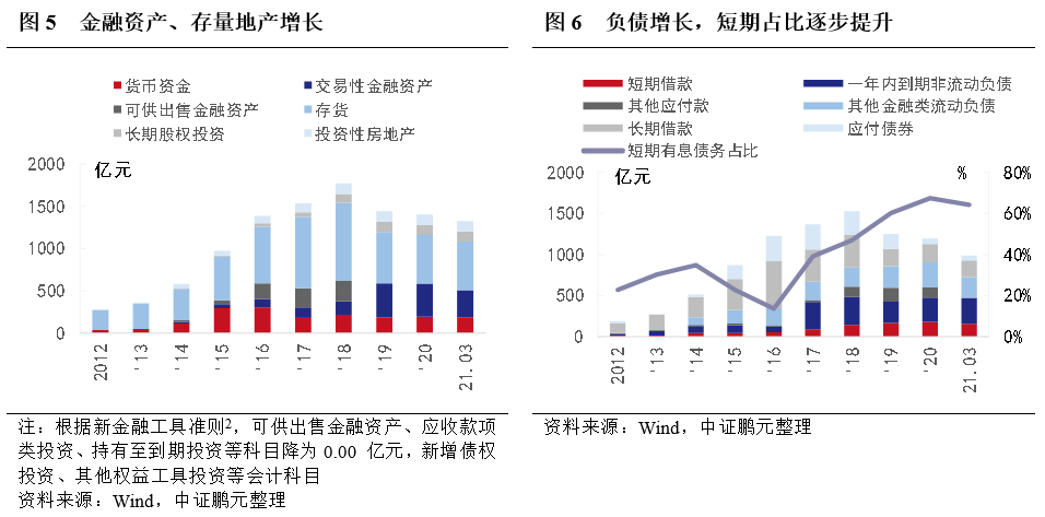 地產(chǎn)和金融不分家的邏輯,在泛海系中延伸。隨著收購(gòu)的推進(jìn),泛海系打造了民生系金融家族,并在其中占有主導(dǎo)地位。轉(zhuǎn)型完成了第一階段的業(yè)務(wù)布局,進(jìn)入第二階段的現(xiàn)金流綜合管理,逐步出現(xiàn)轉(zhuǎn)型中的“陣痛”。第一,地產(chǎn)板塊停止擴(kuò)張,但存續(xù)項(xiàng)目后續(xù)投資規(guī)模較大。公司地產(chǎn)板塊土地資產(chǎn)主要為2016年之前獲得,此后以釋放存量土地價(jià)值為主。隨著地產(chǎn)項(xiàng)目建設(shè)投資的推進(jìn),存貨規(guī)模大幅增長(zhǎng),在資產(chǎn)中占比逐年增加,截至2018年3月,存貨占比63%,在建項(xiàng)目計(jì)劃總投資821.78億元,尚需投資343.94億元,再融資壓力較大。第二,布局金融業(yè)務(wù),帶來(lái)金融資產(chǎn)增長(zhǎng)。通過(guò)收購(gòu)(增資)亞太財(cái)險(xiǎn)、民生期貨、民生證券和民生信托等板塊布局民生系,可供出售金融資產(chǎn)2015年、2016年出現(xiàn)大幅增長(zhǎng),交易性金融資產(chǎn)隨金融板塊業(yè)務(wù)的發(fā)展而增長(zhǎng),但業(yè)務(wù)受制于資管新規(guī)影響,金融業(yè)務(wù)板塊收入在2018年出現(xiàn)放緩,隨著2019年進(jìn)一步布局金融業(yè)以及市場(chǎng)回暖,金融相關(guān)資產(chǎn)占比大幅提升。其中,交易性金融資產(chǎn)主要為子公司民生證券自營(yíng)業(yè)務(wù)投資的證券,變現(xiàn)能力整體較好。第三,負(fù)債大幅增長(zhǎng),短期債務(wù)占比逐步提升,再融資壓力提升。受存量地產(chǎn)業(yè)務(wù)和金融業(yè)務(wù)擴(kuò)張需求影響,2012年后公司負(fù)債規(guī)模出現(xiàn)明顯增長(zhǎng),其中,2014-2016年受地產(chǎn)項(xiàng)目融資增長(zhǎng)影響長(zhǎng)期借款占比大幅提升,隨著債務(wù)逐步到期,2017年以來(lái)短期債務(wù)占比逐漸增加,同時(shí),公司長(zhǎng)期融資規(guī)模出現(xiàn)明顯下降,再融資壓力提升,面臨集中償付風(fēng)險(xiǎn)。