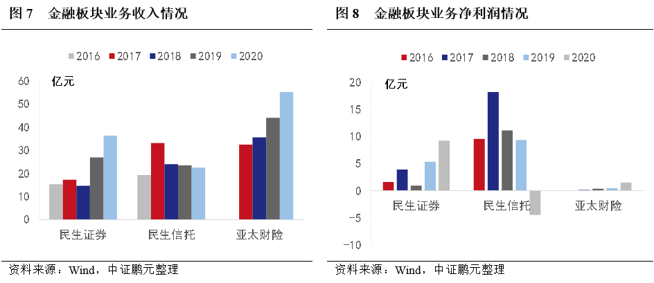 第二,金融板塊收入不確定性較高。金融板塊收入主要來(lái)自民生證券、亞太財(cái)險(xiǎn)和民生信托,受政策和市場(chǎng)環(huán)境影響較大,金融板塊收入增長(zhǎng)相對(duì)緩慢,存在一定波動(dòng)性和不確定性。其中,信托業(yè)務(wù)2018年后收入呈現(xiàn)微幅下降,受風(fēng)險(xiǎn)事件影響大額計(jì)提減值損失,2020年凈利潤(rùn)轉(zhuǎn)負(fù),而保險(xiǎn)業(yè)務(wù)收入呈現(xiàn)增長(zhǎng),但利潤(rùn)率較低。