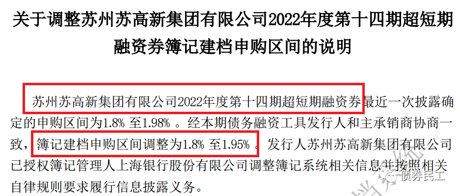 3、蘇州蘇高新集團有限公司2022年度第十四期超短期融資券的申購區間由[1.8%-1.98%]調整至[1.8%-1.95%],即是將利率上限下調了3個BP。蘇州蘇高新集團有限公司的主體信用等級為AAA,實際控制人為蘇州市虎丘區人民政府。