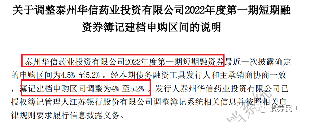 5、泰州華信藥業投資有限公司2022年度第一期短期融資券的申購區間有[4.5%-5.2%]調整至[4%-5.2%],即是將下限下調了50個BP。泰州華信藥業投資有限公司的主體信用等級為AA+,實際控制人為泰州市人民政府。