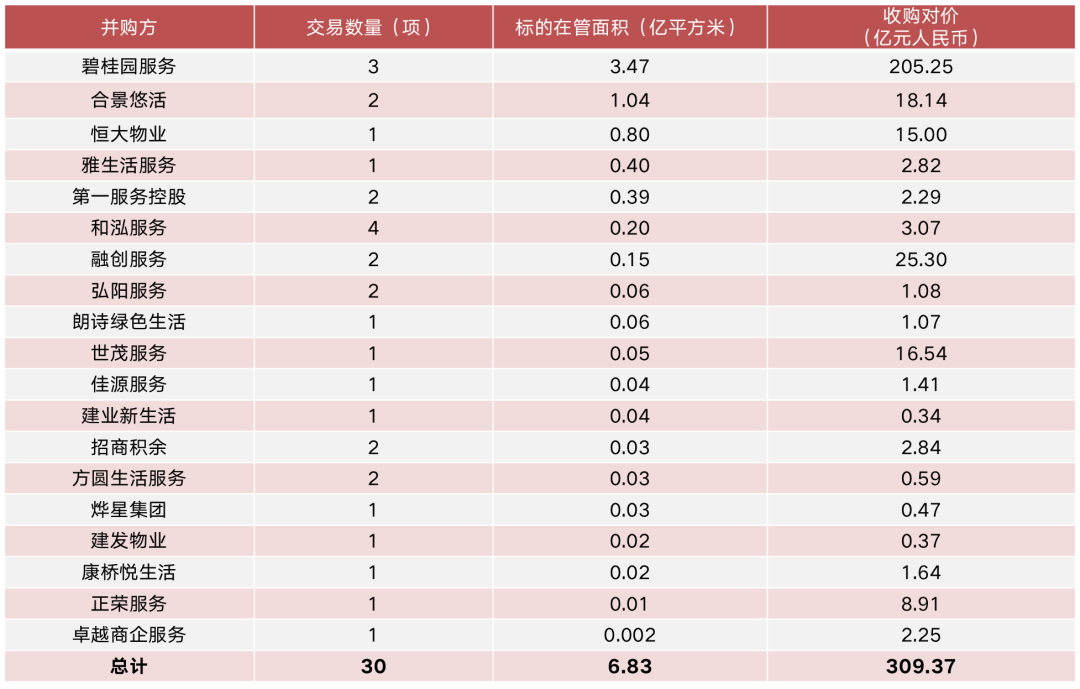 此外,除了上市物企公告披露的收并購事項,非上市物企中,由地產變局引發的物業并購也有發生,例如龍湖智慧服務收購億達服務、楷林商服;萬物云收購伯恩物業等。
