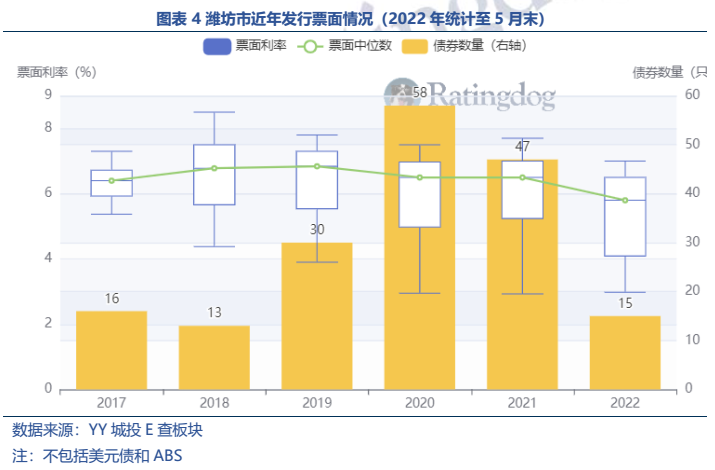 (2)從一級發行來看,濰坊整體融資成本偏高,2021年票面中位數6.5%,明顯高于同期全省票面中位數4.39%的水平。