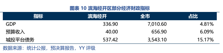 (2)濱海經開區存在過度舉債的情況,21年區域YY Ratio為1,345%,債務負擔很重,但區域的發展潛力不強(10年獲批國家級開發區,發展多年,城投平臺債務占全市的15.17%,預算收入占全市的6.09%;七普人口僅13.67萬人,22年5月房價4,800元/平方米)。