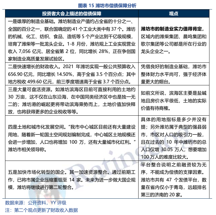 懇談會和信?;鸩⒉荒苤苯痈淖兪袌隹捶ǎㄈ缣m州),具體還是要回歸到區域的支撐來看,投資者會上的對濱海經開區土地的贊揚和中心城區城市化紅利的期盼暫且不論,但濰坊當地制造業水平依然值得肯定,整體財力水平尚可(省內第三),但是在非標壓降、平臺整合和管控及資金運用效率上還需加強。