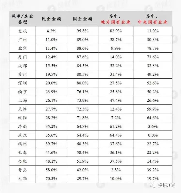 最近一段時間,很多城市都完成了第二批次的集中土地出讓,土拍的結果也都紛紛出爐了。有一組數據,關于部分城市國企和民企拿地比例的統(tǒng)計,非常有意思。