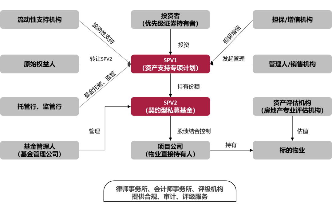 下圖為一個典型的類REITs的交易結構,與公募REITs相比,類REITs少了上層的公募基金,但在專項計劃和項目公司之間多了一個私募基金,其余結構大體相同。
