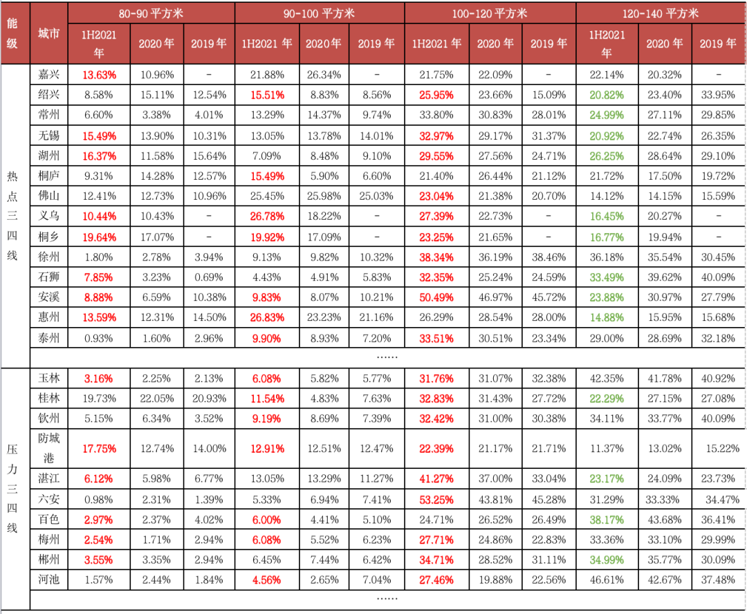 二線城市改善性需求堅挺,三房、四房成交比重仍保持較快增長。2021年上半年,二線城市三房戶型成交占比升至57.88%,較2020年再增1.33個PTS,四房戶型成交占比達到20.26%,較2020年再增1.49個PTS。