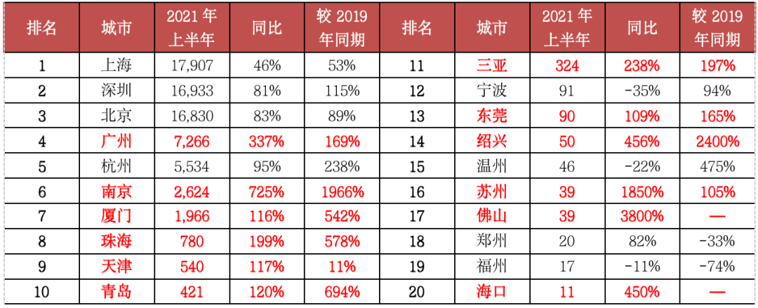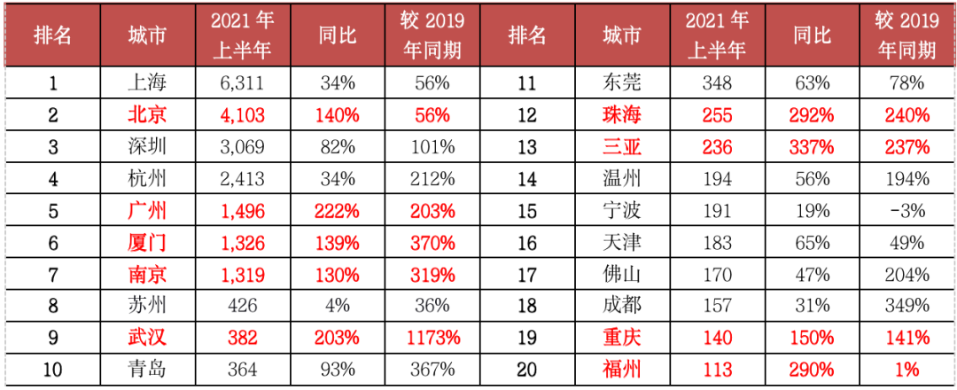 表:2021年上半年單價5萬元/平方米以上豪宅成交套數TOP20城市(單位:套)數據來源:CRIC中國房地產決策咨詢系統