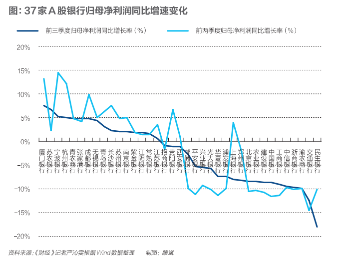 具體來看,三季度大部分銀行的凈利潤同比增速有所回升。Wind數(shù)據(jù)顯示,在A股37家上市銀行中(較半年報新增廈門銀行),20家銀行前三季度凈利潤同比增速較前兩季度有所回升,其中15家銀行同比降幅收窄。交通銀行金融研究中心高級研究員武雯指出,撥備計提力度減弱是凈利潤同比降幅收窄的首要因素。