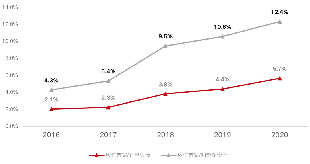 應(yīng)付票據(jù)/有息負債以及應(yīng)付票據(jù)/歸母凈資產(chǎn)(單位:%)