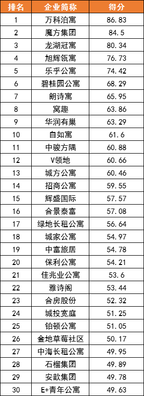 TOP30集中式長租公寓企業中魔方公寓、樂乎公寓等創業系企業在行業初始入局,挺過“危機”期,證明了其強大的運營能力。