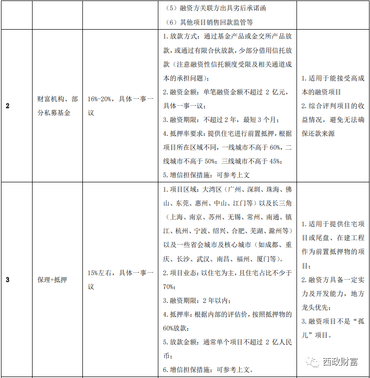 目前市面上能操作中小開發(fā)商融資業(yè)務(wù)的資金機(jī)構(gòu),除了前文提到的一些依托于開發(fā)商背景的資金機(jī)構(gòu)及大型的地產(chǎn)投資機(jī)構(gòu)外,還包括一些小貸機(jī)構(gòu)、三方財(cái)富公司及少部分私募基金、個(gè)人金主、少部分國(guó)央企背景的資金及資產(chǎn)管理機(jī)構(gòu)(非金不良模式)。其中小貸機(jī)構(gòu)的成本一般集中在年化16%-18%,三方財(cái)富公司及少部分私募基金因其資金受限于資金募集(當(dāng)前產(chǎn)品形式受限、私募等機(jī)構(gòu)頻繁爆雷增加了募集難度),其成本一般在年化18%-20%左右,個(gè)人金主的融資成本相對(duì)更高一些,但該類資金往往可以接受項(xiàng)目下沉到三四線城市。另外,依托于開發(fā)商背景的資金機(jī)構(gòu)、大型的地產(chǎn)投資機(jī)構(gòu)以及少部分國(guó)央企、資產(chǎn)管理機(jī)構(gòu)因?yàn)槠滟Y金主要是自有資金,其融資成本則相對(duì)低一些,普遍在年化15%左右,當(dāng)然對(duì)于優(yōu)質(zhì)的主體并提供前置抵押的情況下,融資成本可到年化12%-13%,或者更低。