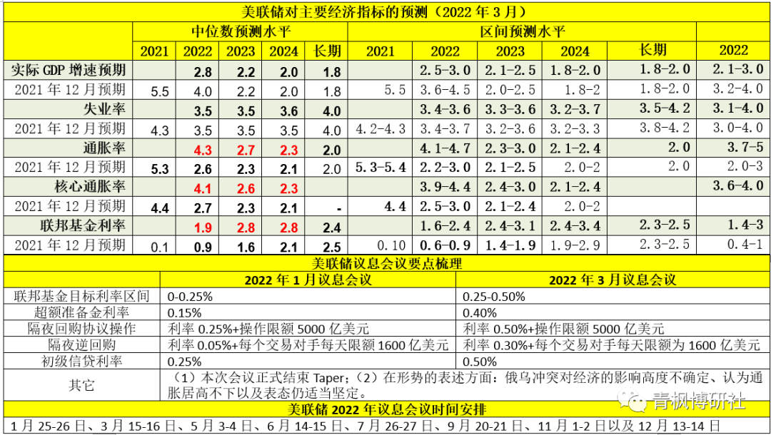 2、大幅上調了對通脹率的預測,如將2022-204年的通脹率分別由2.6%、2.3%、2.1%上調至4.3%、2.7%和2.3%,將核心通脹率分別由2.7%、2.3%、2.1%上調至4.1%、2.6%和2.3%。可以看出,對2022年的通脹率上調幅度最大。