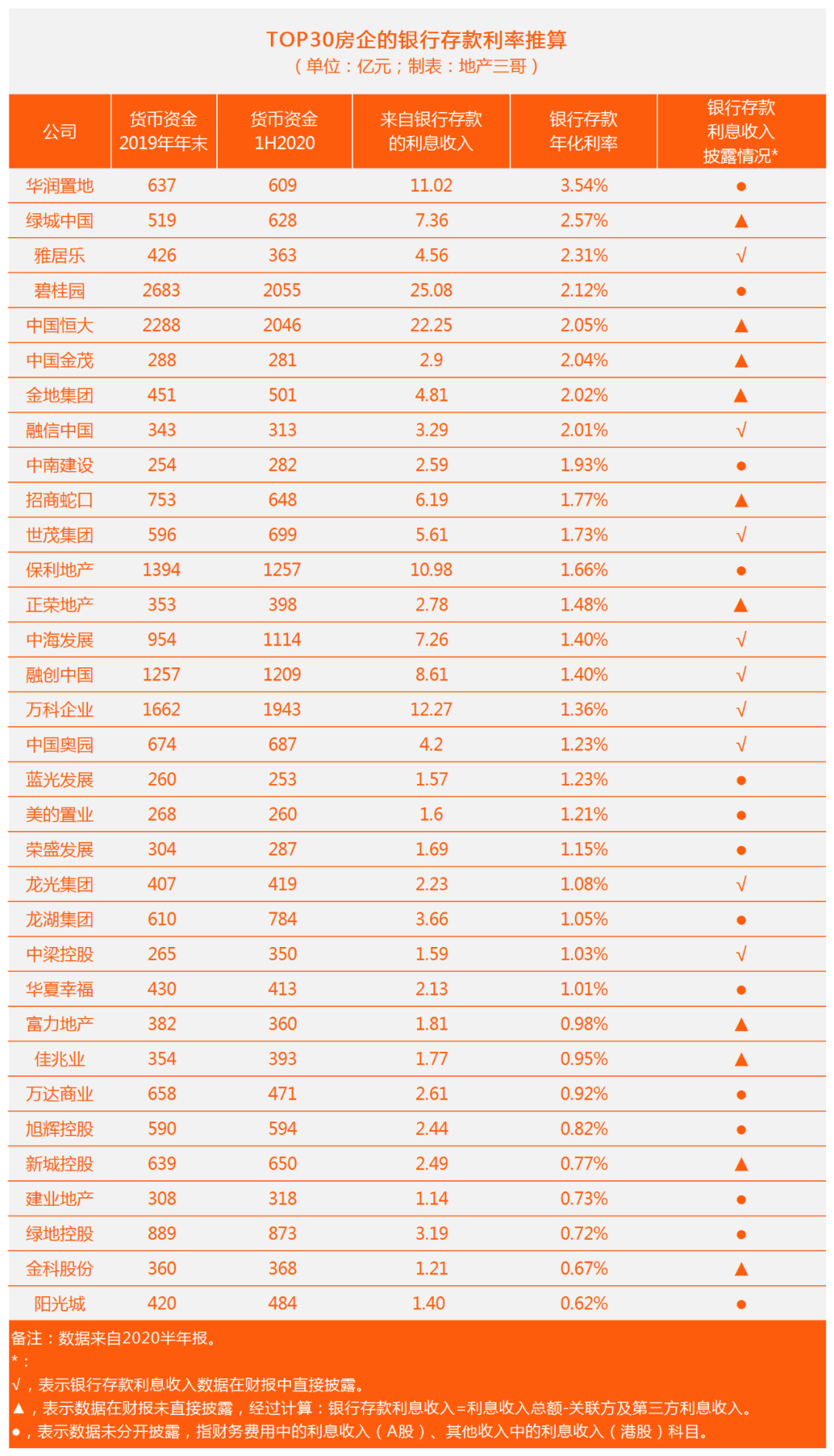 融創、中海、萬科、奧園都直接披露了銀行存款利息收入,年化的存款利率區間在1.2%-1.4%。