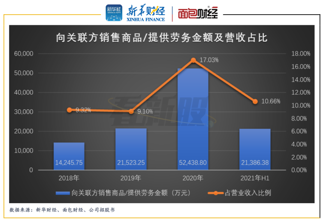2018年至2021年上半年,螢石網(wǎng)絡(luò)向關(guān)聯(lián)方銷售商品/提供勞務(wù)的金額分別達(dá)到1.42億元、2.15億元、5.24億元和2.14億元,分別占同期營業(yè)收入的9.32%、9.10%、17.03%和10.66%。