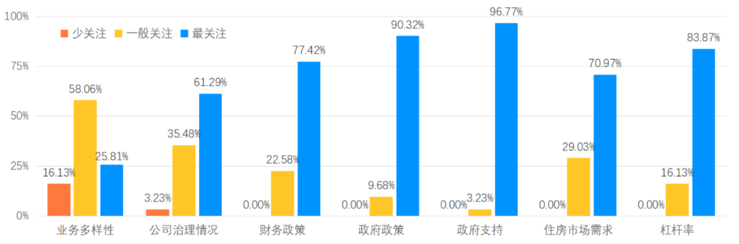 對(duì)于投資者在投資房地產(chǎn)債券時(shí)會(huì)考慮的因素方面,大部分的受訪者最關(guān)注發(fā)行人的公司治理情況、財(cái)務(wù)政策、政府政策、政府支持程度、住房市場(chǎng)需求、發(fā)行人的杠桿率、表外債務(wù)水平、離岸信用評(píng)級(jí)、公司管理層素質(zhì)和股東結(jié)構(gòu)。而大多數(shù)受訪者表示發(fā)行人公司的業(yè)務(wù)多樣性、市場(chǎng)地位、在岸信用評(píng)級(jí)和盈利能力屬于一般考慮因素。一位受訪者提到,發(fā)行人公司的是否上市也是一個(gè)考慮因素(見附表10)。