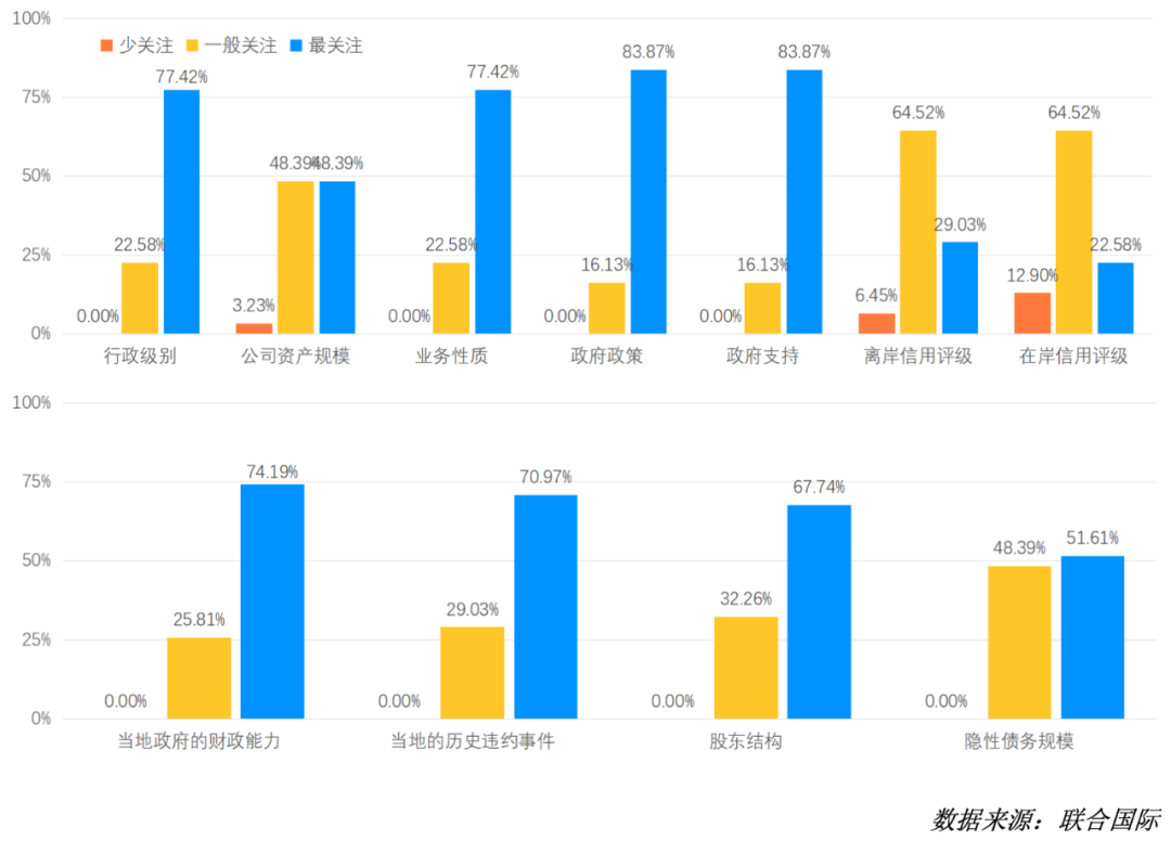 對(duì)于投資者在投資城投債券時(shí)會(huì)考慮的因素方面,大部分的受訪者最關(guān)注發(fā)行人的行政級(jí)別、業(yè)務(wù)性質(zhì)、政府政策、政府支持程度、當(dāng)?shù)卣呢?cái)政能力、當(dāng)?shù)氐臍v史違約事件、股東結(jié)構(gòu)和隱性債務(wù)規(guī)模。關(guān)于城投發(fā)行人的公司資產(chǎn)規(guī)模,約半數(shù)受訪者表示最為關(guān)注,約半數(shù)受訪者持一般態(tài)度。他們中許多人對(duì)離岸和在岸信用評(píng)級(jí)持中立態(tài)度(見附表11)。