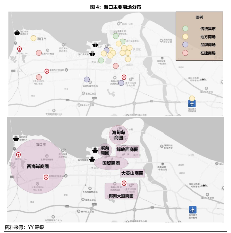 不同于一線城市核心物業,三線城市的自持物業往往被視為開發商勾地手法下的配套產物,多為住宅項目的邊角料,不具備價值。但隨著新城和龍湖等開發商在三四線城市的大量自持物業開盤,此類區域的商業競爭格局與策略亦勢必探討之,關注其定價合理性。因而借春節期間得以在海口實地調研,觀察市內商業物業情況。