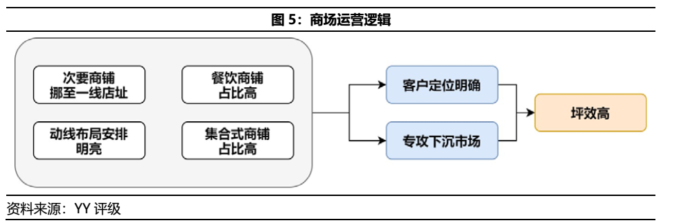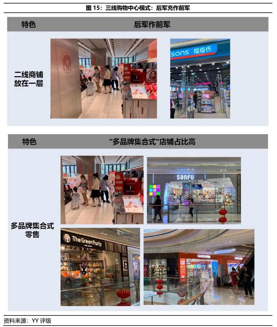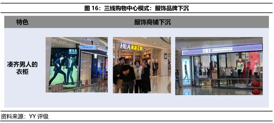 三線城市購物中心與一線城市核心物業的差異多體現于下沉市場的店鋪配置策略,即是所謂的“后軍作前軍,將二軍充作一軍”。