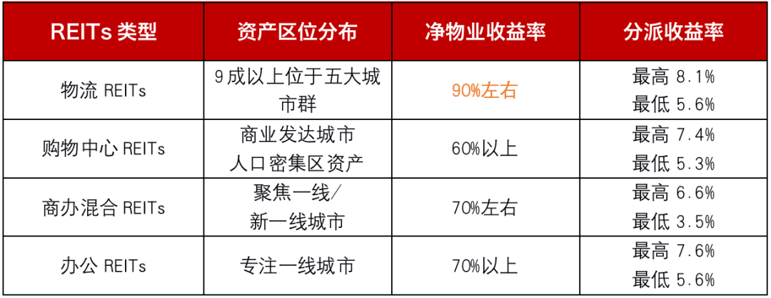 從凈物業收益率來看,對物流資產要求最高,海外物流REITs的資產凈物業收益率接近9成,辦公、商辦資產也要做到70%以上。