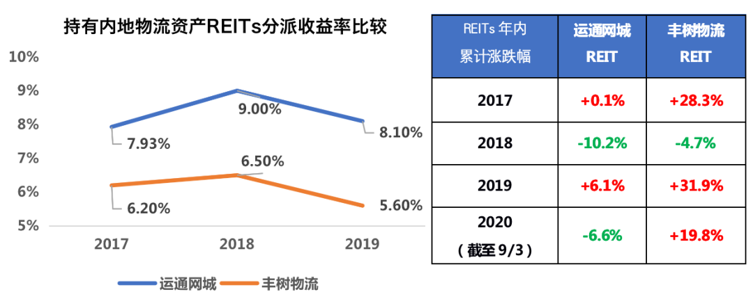 物流REITs方面,運通網城的分派收益率一直維持在高位,這不僅是因為運通網城每年派息金額較為穩定,也與其價格一直漲幅不大有關。