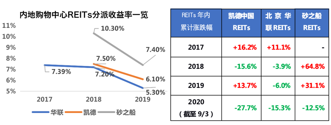 今年受國內消費收縮影響,對商業沖擊較大,據凱德中國和北京華聯2020年半年報數據,REITs收入及物業凈收入均有不同程度的下跌,受此影響,三只內地購物中心REITs行情的修復仍需時日。
