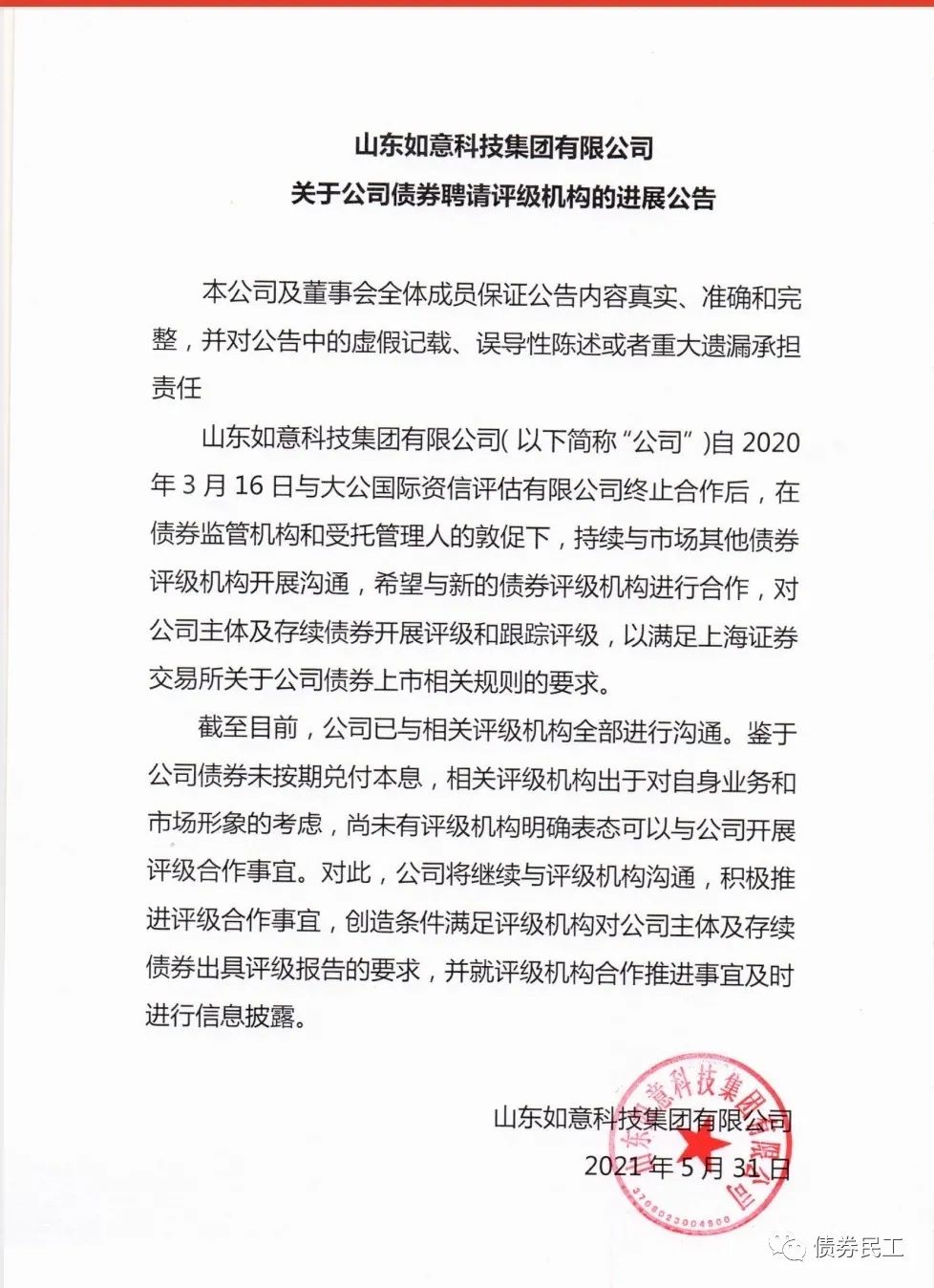 根據(jù)山東如意科技集團(tuán)有限公司2021年5月31日的公告,自公司2020年3月16日終止與大公國際的評級合作之后,公司與評級機(jī)構(gòu)全部溝通完畢,沒有評級公司與公司開展評級合作。