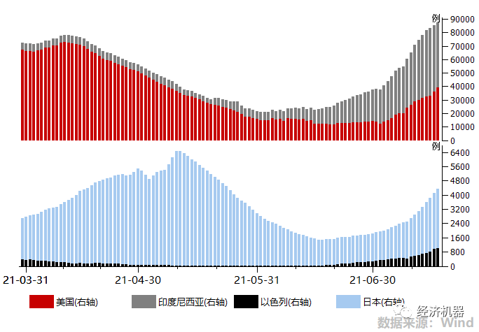 近期,美國,以色列等傳統上認為疫苗接種效果最好的國家,疫情也出現再次反彈。人口大國印度尼西亞近期感染人數出現飆升。日本疫情也出現抬升跡象。東京奧運會本周開幕,糟糕的防控水平下,很有可能成為另一個“病毒狂歡節”。此外,種種跡象表明,海外疫情再次惡化的概率在提升。“疫苗信仰”是當前支撐經濟和市場預期的一個核心邏輯,這一信仰一旦被打破,或將對風險資產價格造成一波沖擊。